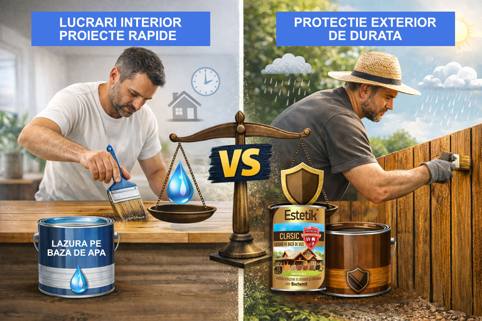 - Alege Estetik Clasic daca vrei o lazura versatila pentru interior si exterior, cu aspect natural si protectie buna.