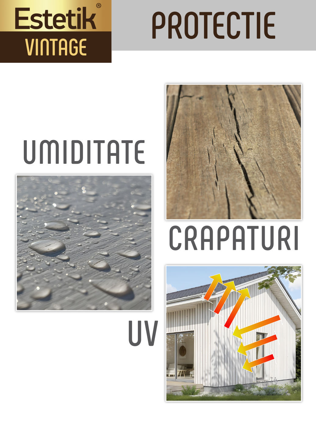 Estetik Vintage este o lazura lemn profesională, pe bază de ulei sintetic, creată pentru finisarea decorativă și protectivă a elementelor din lemn aflate atât la exterior, cât și la interior. Formulată cu nanopigmenți anorganici și aditivi performanți, aceasta pătrunde adânc în structura lemnului, protejându-l eficient de radiațiile UV și intemperii.